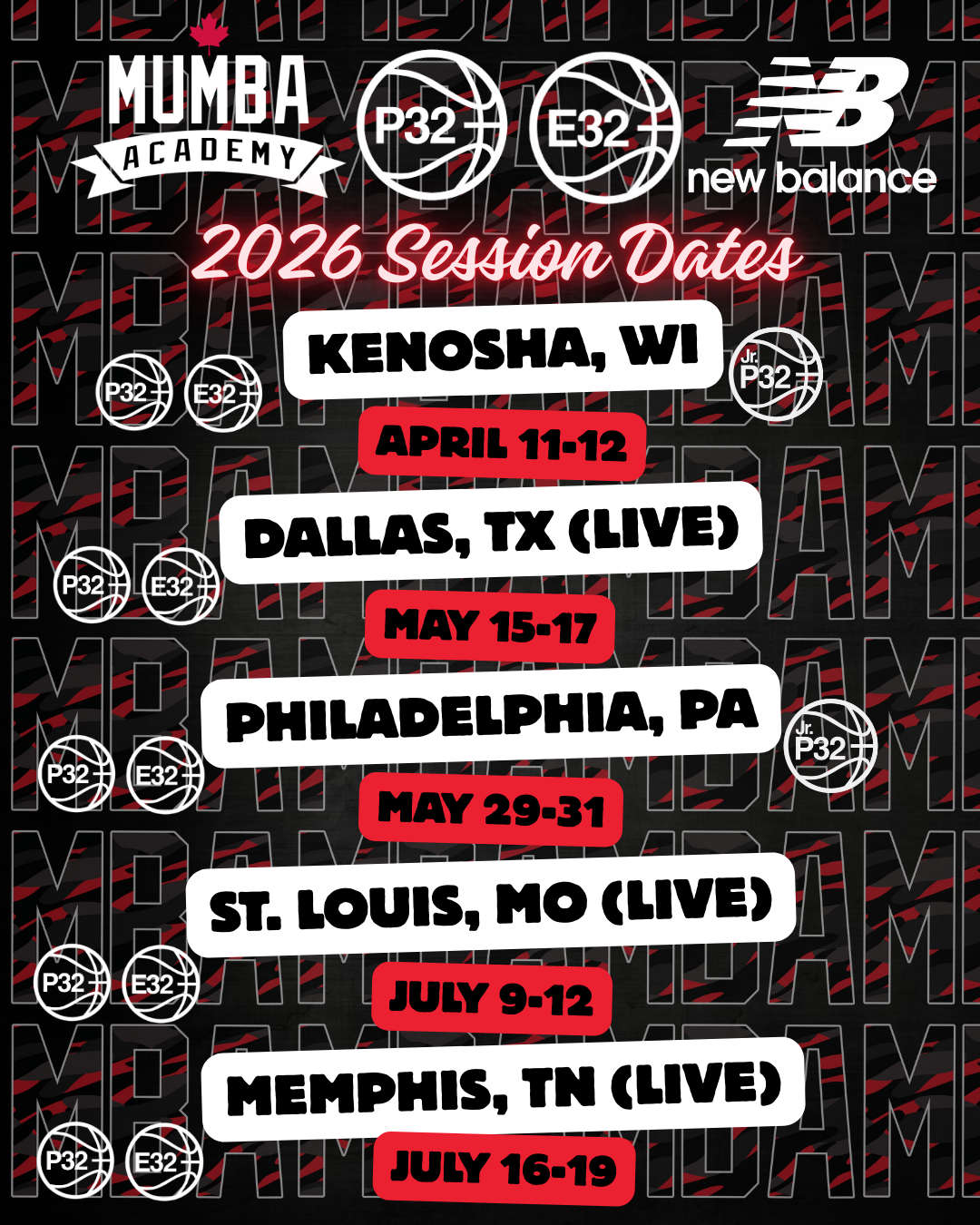 | MBA JR P32 – 13U | 2012 | Markham Pan Am Centre Gym 1 16 Main St Unionville, Markham, ON L3R 0W7 Map→ | Saturday January 24th, 2025 10am to Noon | Register→ $20 |